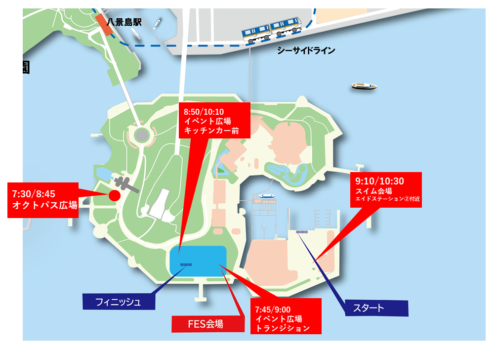 | 9時10分~ | スイム会場案内(スイム会場エイドステーション②付近集合)、 計測チップ受取、ウエットスーツ着用 |
